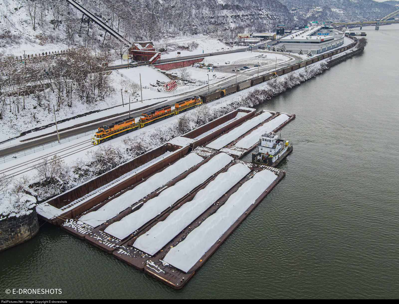 CSX train U065 sporting Buffalo And Pittsburg Power, passes a barge getting ready to move loads down river.