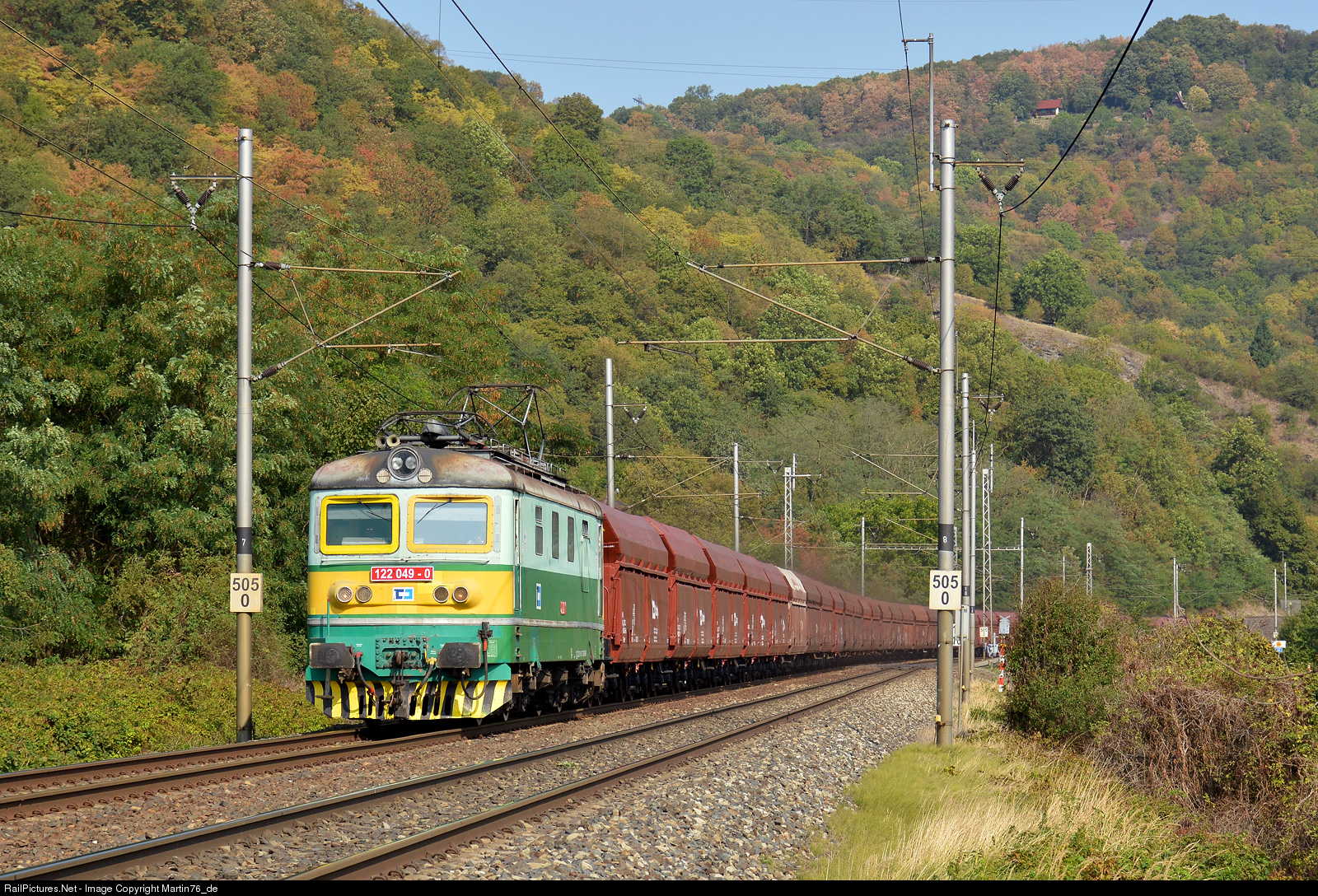 | The electric locomotive 122 049-0, which is already unique on Czech railways due to its painting, hauling a freight train from B?ezno u Chomutova to the "M?lník" power plant. |
