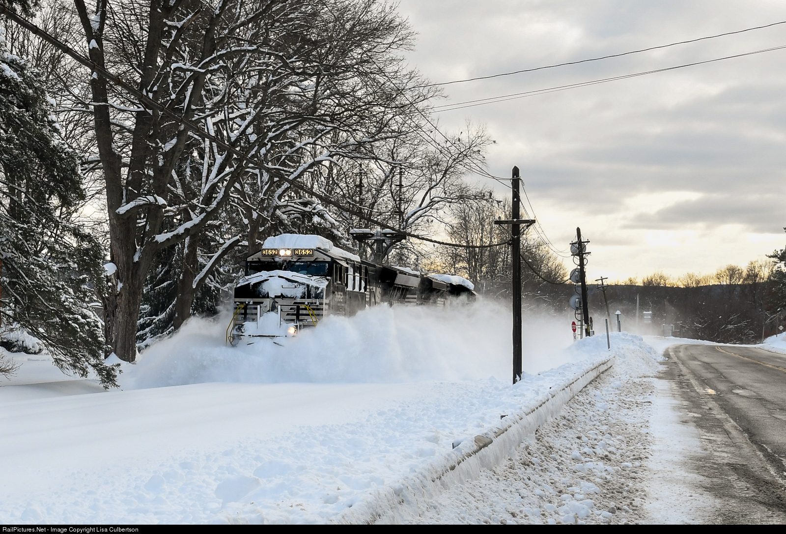 After a historic snowstorm dumped over 41" of snow on Binghamton, NY, NS decided a light engine plow train was in order. After a quiet day on the line, this plow extra appeared just before sunset. Shown here heading north through the classic D&H signals in Afton, NY.