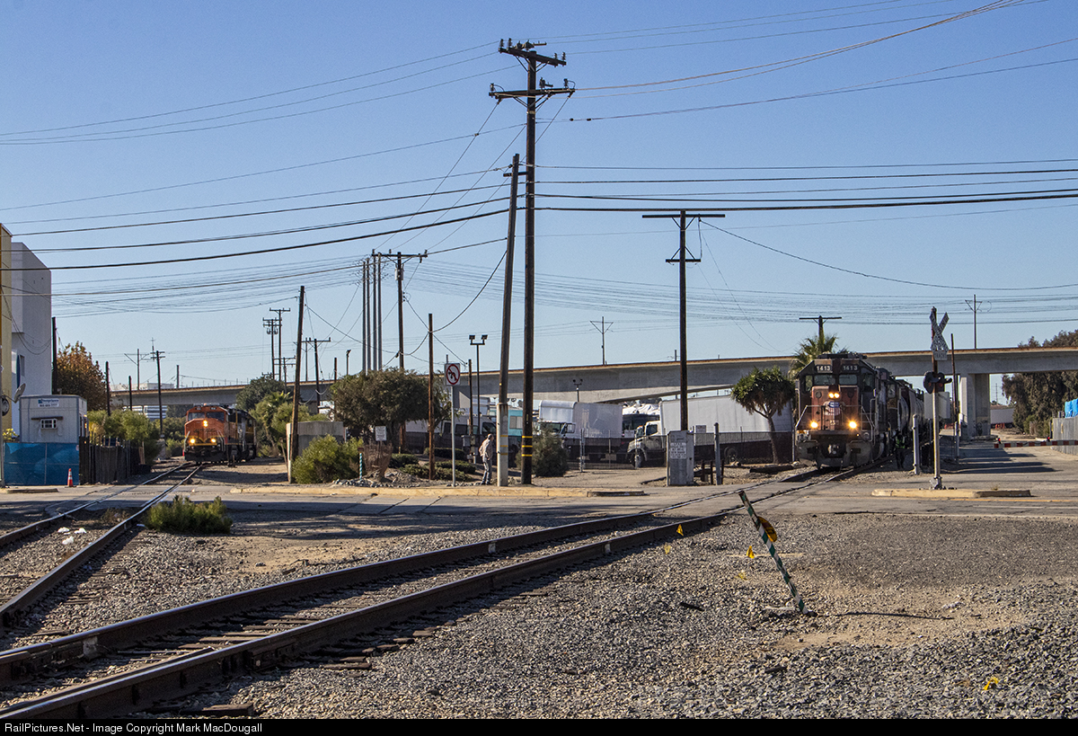 In a rare sight, both BNSF and UP's locals are switching their respective interchanges with Chevron's in plant switching operation in El Segundo. On the left, BNSF's "748" relief job, the Y-WAT1041-19I, begins to shove their inbounds off the Harbor Sub and into the yard. On the right, UP's LOW20 "El Segundo Local" makes a switching move of their own with an SP painted GP40-2 leader. The bridge in the background is LA Metro's C/Green Line Light Rail route from Norwalk to Redondo Beach.