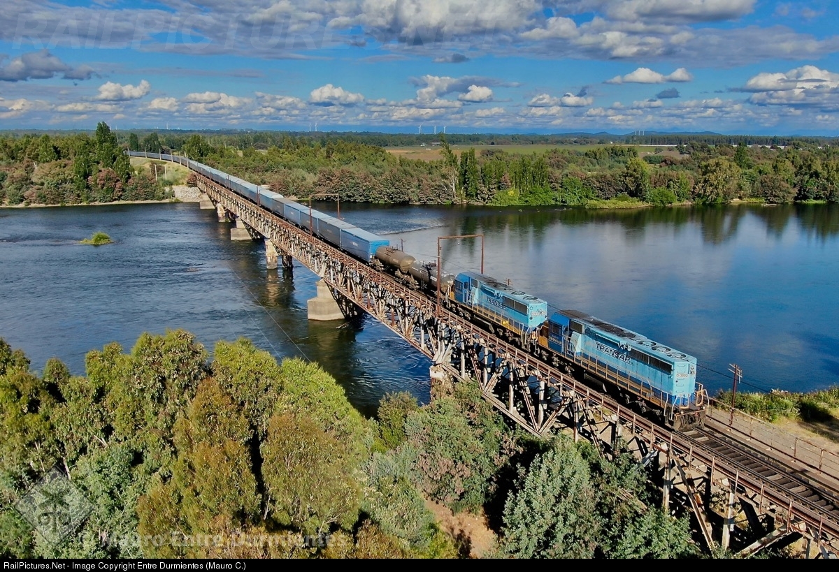 | Southbound TRANSAP cellulose train returns to the CMPC pulp mill facility located in Mininco, crosses the 600 meters long Coihue bridge, passing over the Bio-Bio River. |