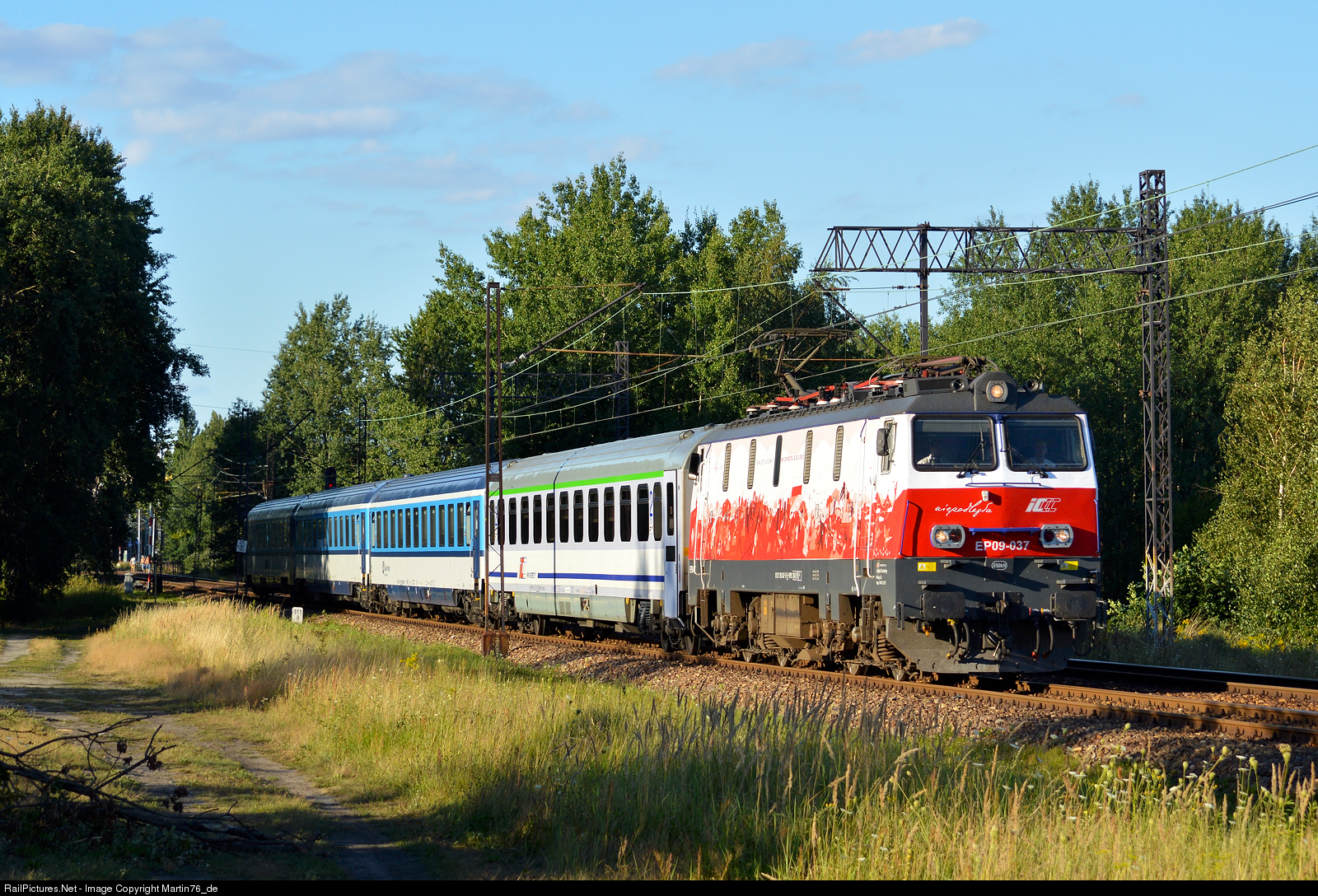 | Electric locomotive EP09-037 hauling a passenger train IC "Porta Moravica" from Warszawa Wschodnia to Praha hl. n. |