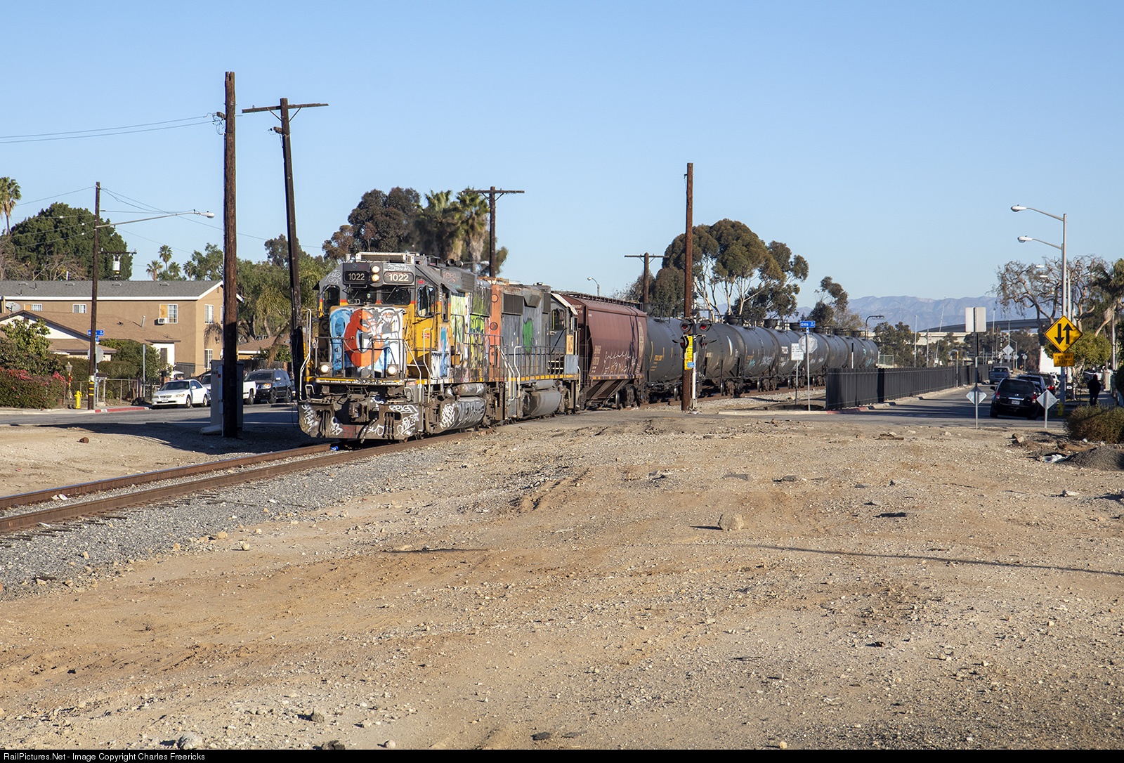 | The El Segundo Local (looking a bit like a nursery school finger painting project gone wrong) comes around the curve onto the Torrance Industrial Lead to work Conoco Philips. Trailing unit is the last GP40-2 in SP colors. |