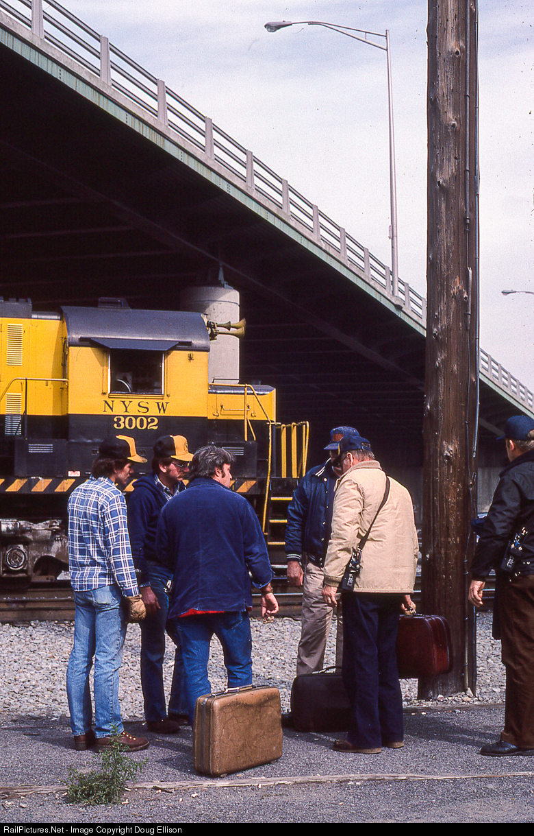 The NYS&W crew turning the eastbound train over to Conrail near Binghamton Yard in October of 1984. The NYSW crew members on left: Brian Hartwell, Joe White and A. G. "Ponch" Whitehill.