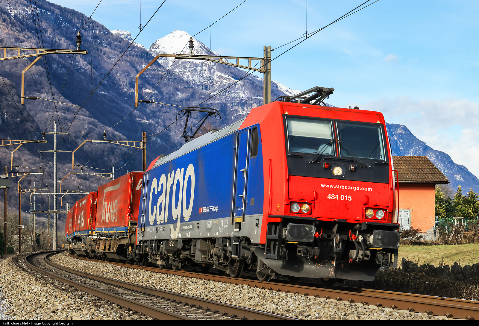 Bombardier TRAXX F140 MS Re 484 # 015 of SBB Cargo, rented to SBB Cargo International, is pulling the "Winner" (large forwarder) train 42001 from Wuppertal Langerfeld container terminal via Basel-Bözberg-Gotthard Base Tunnel-Ceneri Base Tunnel (CBT)-Chiasso to Piacenza/Italy, on the Gotthard line between Claro and Castione-Arbedo. The train had about 1400 ton and needed an additional locomotive from Bellinzona to Chiasso, despite the new CBT, since from Lake Lugano at Capolago to Mendrisio the gradient is still considerable. In the background is the snow covered 2182 meter high Cima di Negrös.