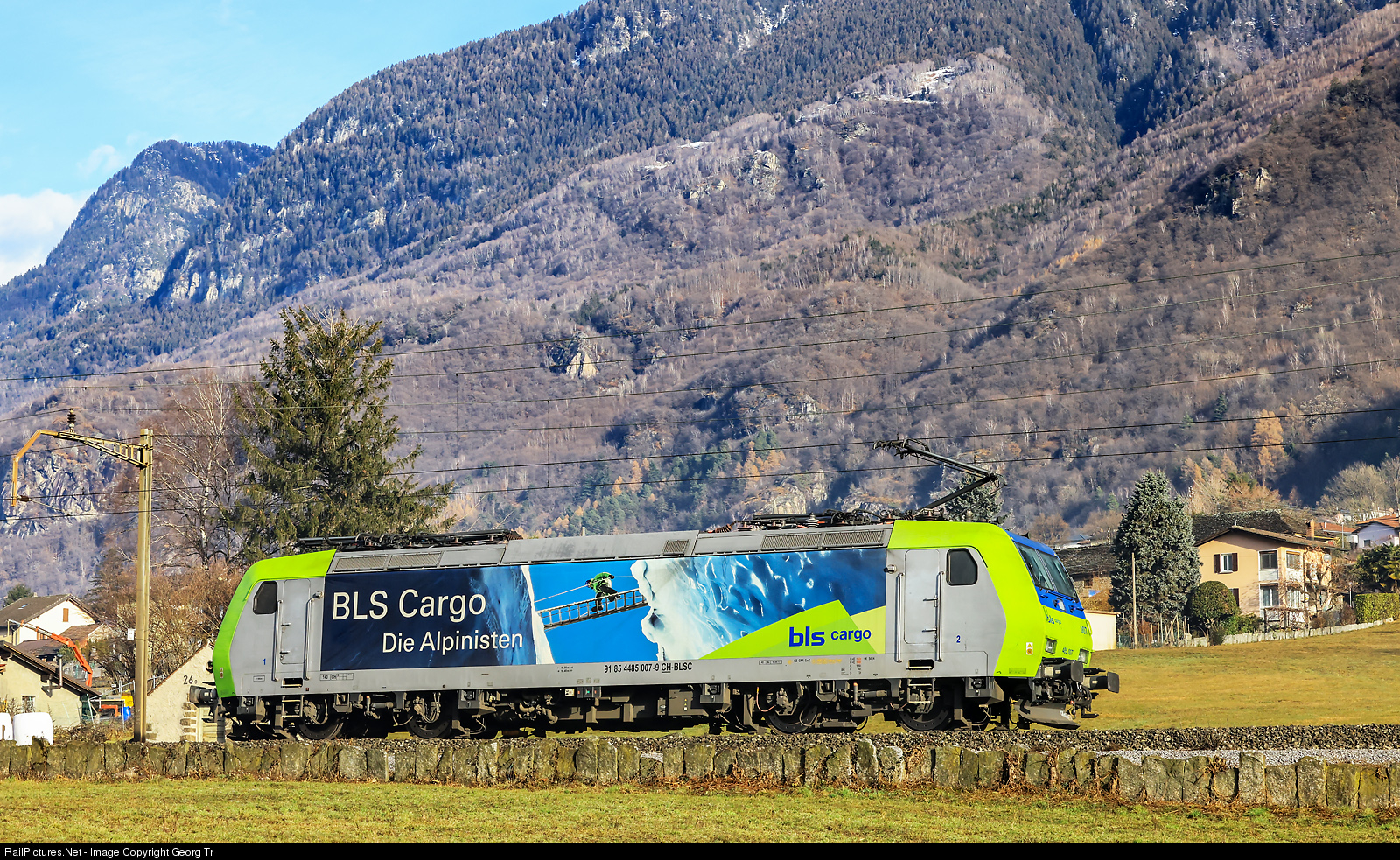| Bombardier TRAXX F140 AC1 Re 485 # 007 of the BLS Cargo is running light from Bellinzona to Flüelen, on the Gotthard line between Castione-Arbedo and Claro. The picture on the side wall with the alpinist crossing a crevasse on a ladder is not typical for Switzerland, but for the Himalayas. But of course it had to be something spectacular. |