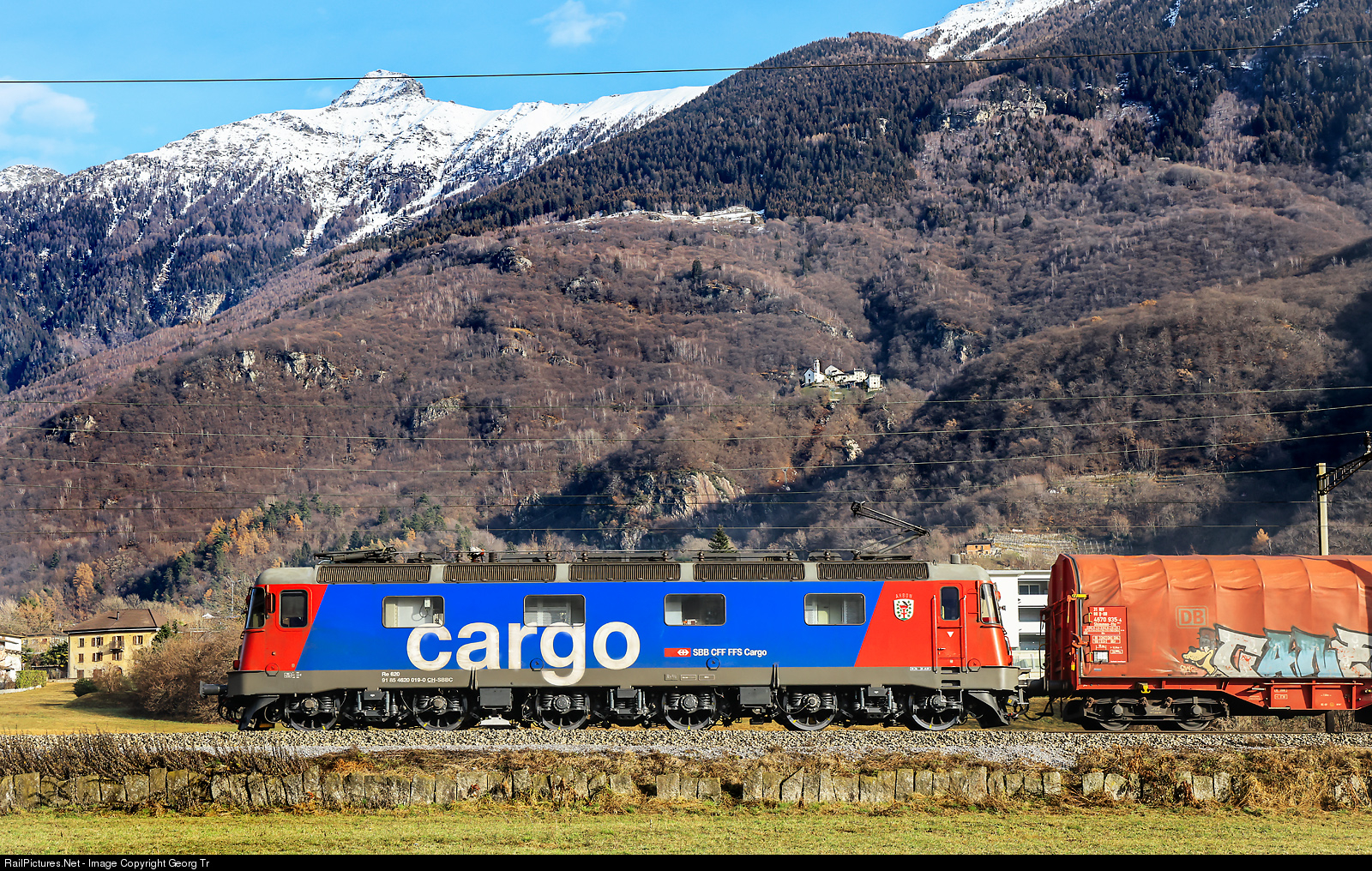 | Re 620 # 019 "Arbon" (Re 6/6 # 11619) of the SBB is pulling the northbound freighttrain 60156 from Chiasso Smistamento to Basel RB on the Gotthard line between Castione-Arbedo and Claro. In the background the Santa Maria monastery and the snow covered Pizzo di Claro. |