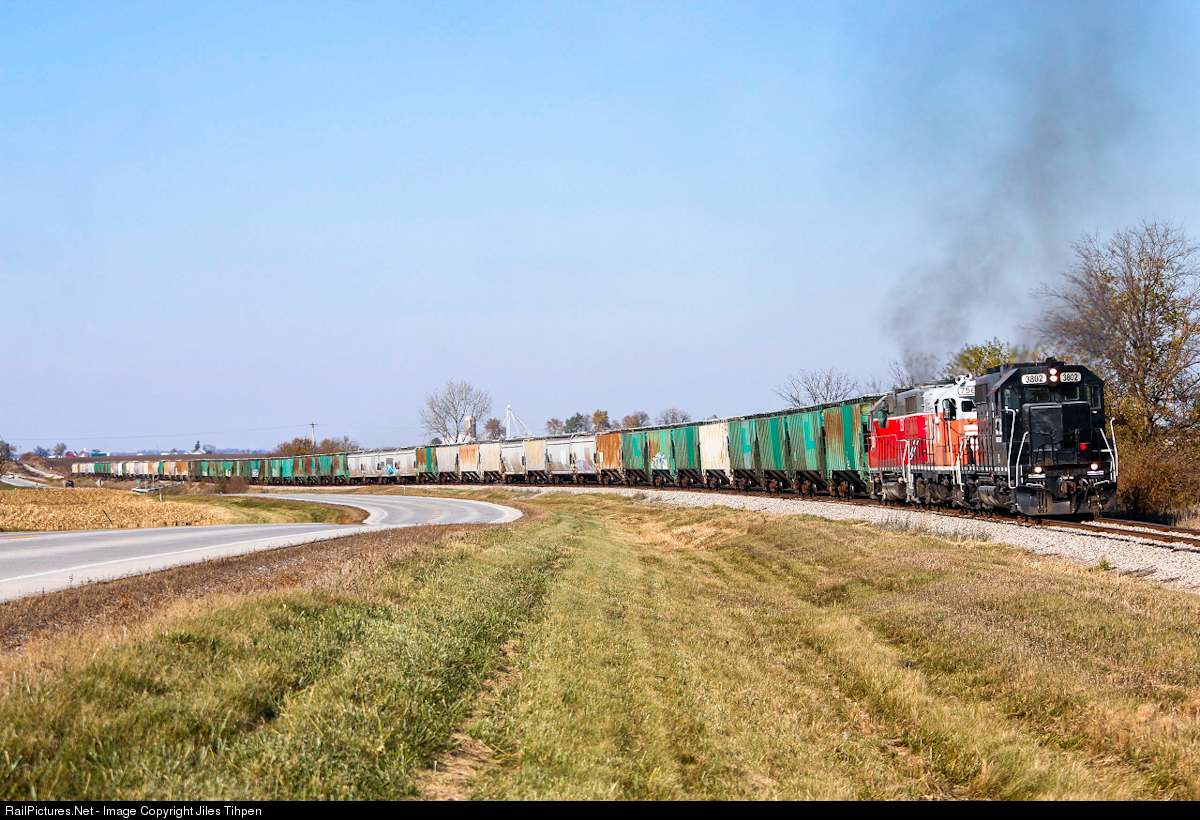 LTEX 3802 leads a Bloomer Line grainer into the curve at Sibley Illinois with an other LTEX leaser and a Bloomer geep.