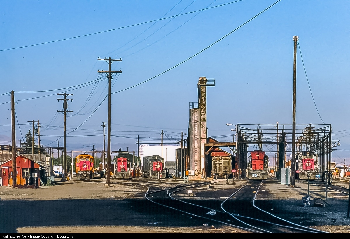 | An assortment of Southern Pacific EMD power I visible in the SP engine terminal in Bakersfield, California. To the left is Daylight-painted SD40E 7342, which is in town to assist 4-8-4 4449 over Tehachapi the next day. |