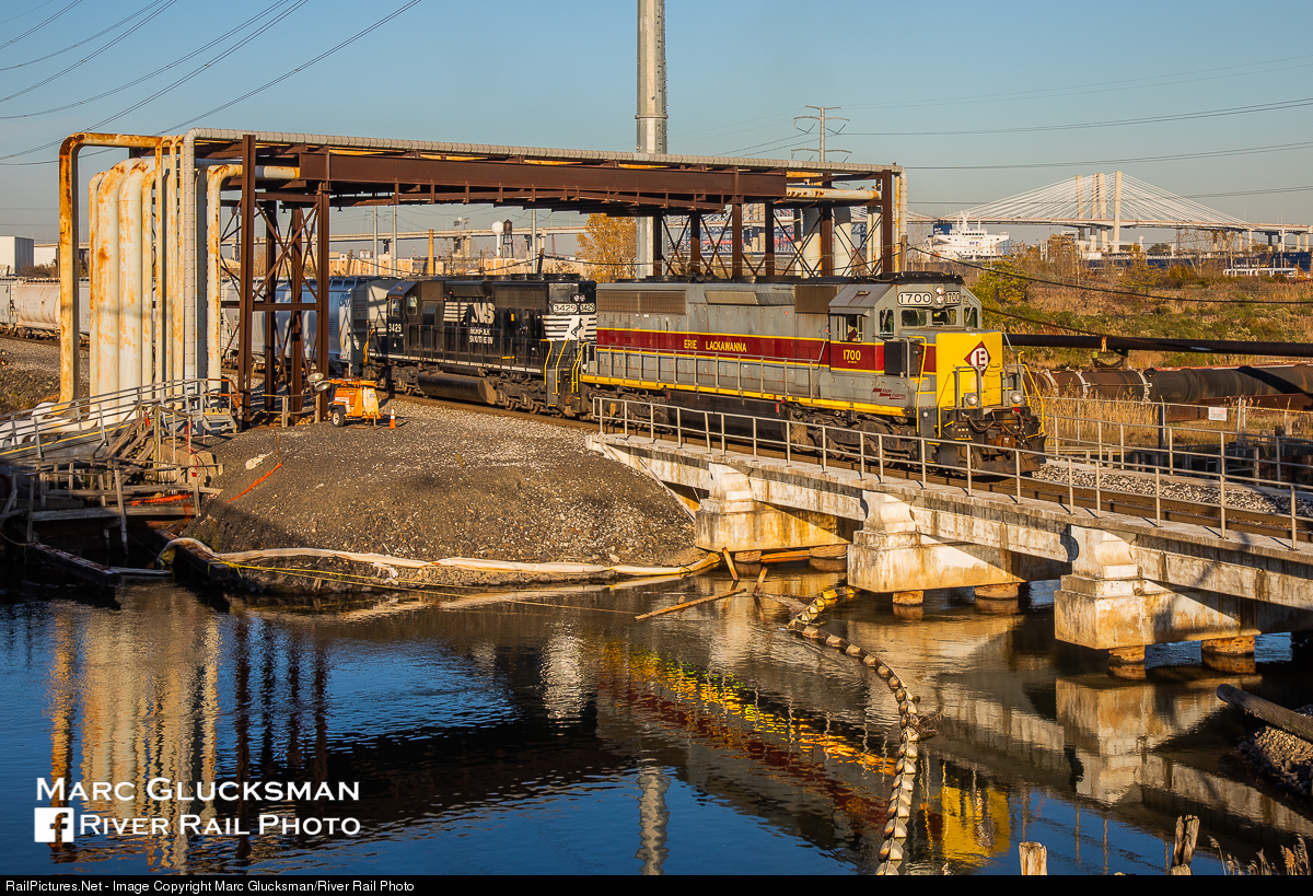 On Short Time. For those who have enjoyed Norfolk Southern Corp 1700 (SD45-2, Erie Lackawanna Heritage) making the somewhat regular trips between Oak Island Yard in Newark, New Jersey and Browns Yard in Sayreville, New Jersey, your time appears to have come to an end. With the introduction of PTC on the NJ Transit Newark Division, these units will not be able to run on this trackage after December 31, 2020. On Friday, November 6, 2020, Conrail Shared Assets OI16 is seen crossing over Morses Creek while servicing the Bayway Refinery in Linden, New Jersey, with Goethals Bridge in the background. This and other NS units not so equipped with compatible PTC systems will still be able to lead on most other Norfolk Southern trackage, or other Conrail Shared Assets assignments that do not cross Amtrak or the Newark Division of New Jersey Transit.
