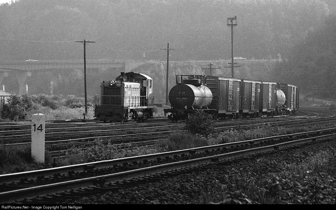 At sunset on a summer evening, a Boston & Maine SW9 works the largely empty yard at White River Junction, VT. Milepost 14 gives the distance to Windsor, where ownership of the Connecticut River Line switches from the Central Vermont to the B&M.