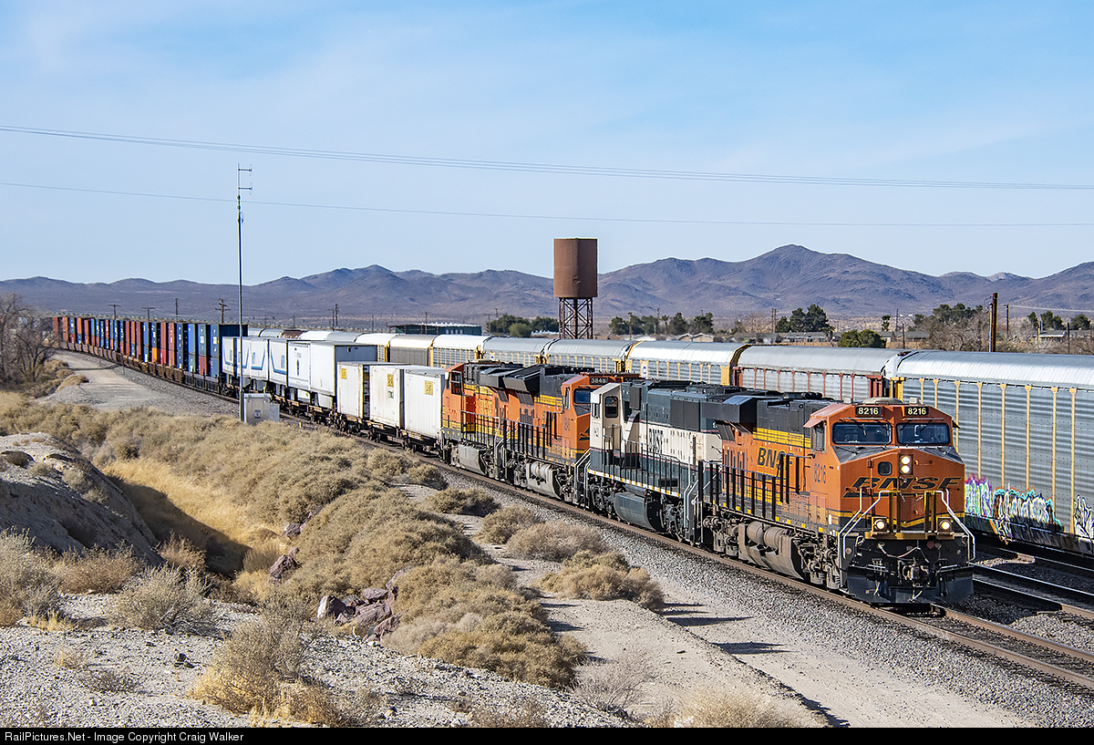 Rolling into Barstow, where the crew will be relieved and the train fueled, is BNSF train Z-LACMEM7-22, a Priority UPS-LTL Intermodal train making its way from Los Angeles to Memphis. Power for this train is ES44C4 8216, SD70MAC 9821, ET44C4 3848 and ES44DC 7730. (Barstow, California – December 23, 2020)