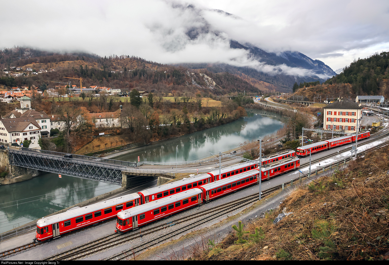 Half of the six "Stammnetzpendel" (push-pull trains of the main network) with railcars Be 4/4 from the 1971/1979 on this picture in Reichenau-Tamins. In the foreground is train 9130 from Samedan to Untervaz-Trimmis with railcar Be 4/4 # 515 and cab car ABDt # 1712. Stabled in the stub track and waiting to be scrapped are Be 4/4 # 511 with cab car ABDt # 1715 and Be 4/4 # 512 with ABDt # 1714. This day, the push-pull train, which serves as replacement train in the Engadine in case of delays or cancellation of timetabled trains, was replaced. In the afternoon, a train with railcar Be 4/4 # 514 run from Untervaz to Samedan. All this 6 trains from the years 1971/1979 are due to be scrapped till the end of 2021.