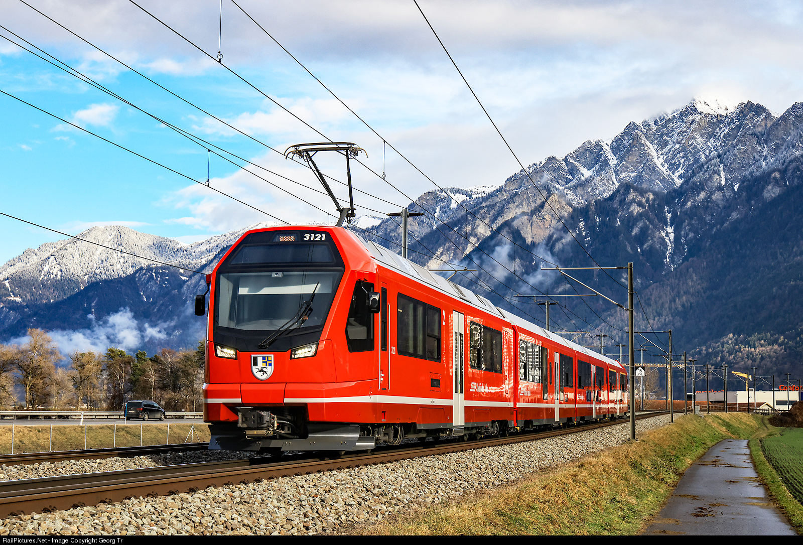 | New "Capricorn" ABe 4/16 # 3121 of the Rhaetian Railway is running the S 1 service 1517 from Schiers via Landquart-Chur to Rhäzüns, between Chur and Felsberg. The RhB ordered 56 of this trains from StadlerRail. |