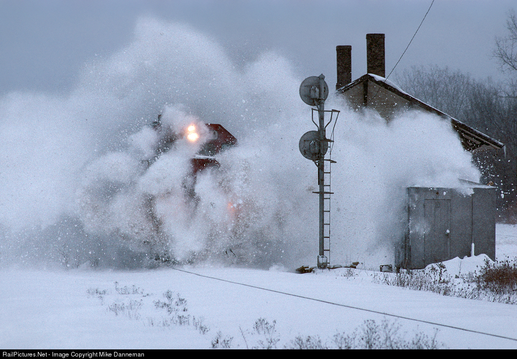 On February 25, 1994, it’s still snowing and dusk is approaching as Soo Line train 421 blasts west through Brookfield, Wisconsin, with Soo EMD SD60 No. 6014 clearing the way, and has all but obscured itself and the Brookfield depot with flying snow.