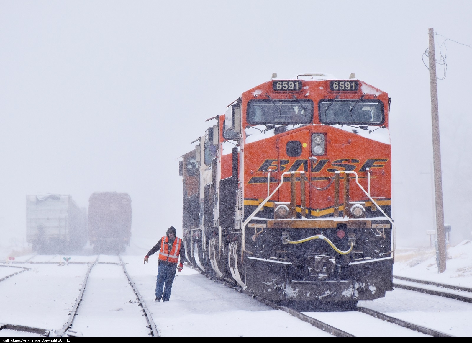 The snow is falling fast as a BNSF crewman gets out to throw a switch in the BNSF North Yard in Fort Collins, Colorado.