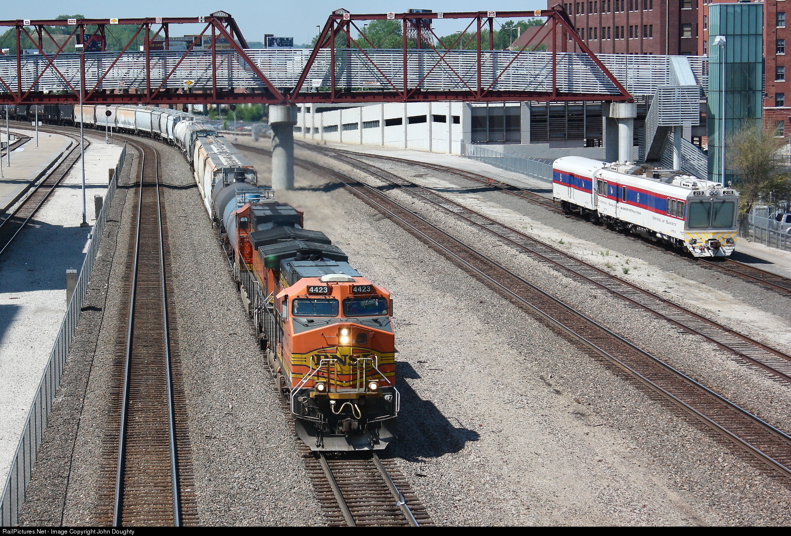 BNSF 4423 leads an eastbound mixed manifest train past the Kansas City Union Station, and the Federal Railroad Administration 219.