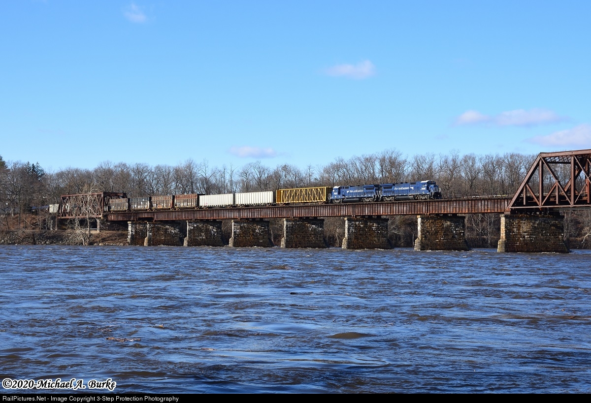 On Saturday, December 26, 2020, Pan Am Railways PLED from Plainville, CT to East Deerfield, MA, made a daylight run over Amtrak’s Springfield Line. Trains EDPL and PLED are normally nocturnal runs due to the daily commuter trains that traverse the line. The pair of former CSX B40-8s with tonnage for East Deerfield yard, passes over the high swift-flowing waters of the Connecticut River. A snowstorm a week before and then warmer temperatures with heavy rain resulted in rapid melting, causing the river to rise above its flood stage.