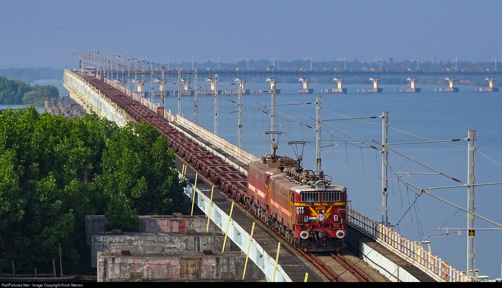 AJJ WAG5 multiple units hauled empty container rake passing through 4.62 km long Vembanad Bridge. This one is the longest railway bridge in India