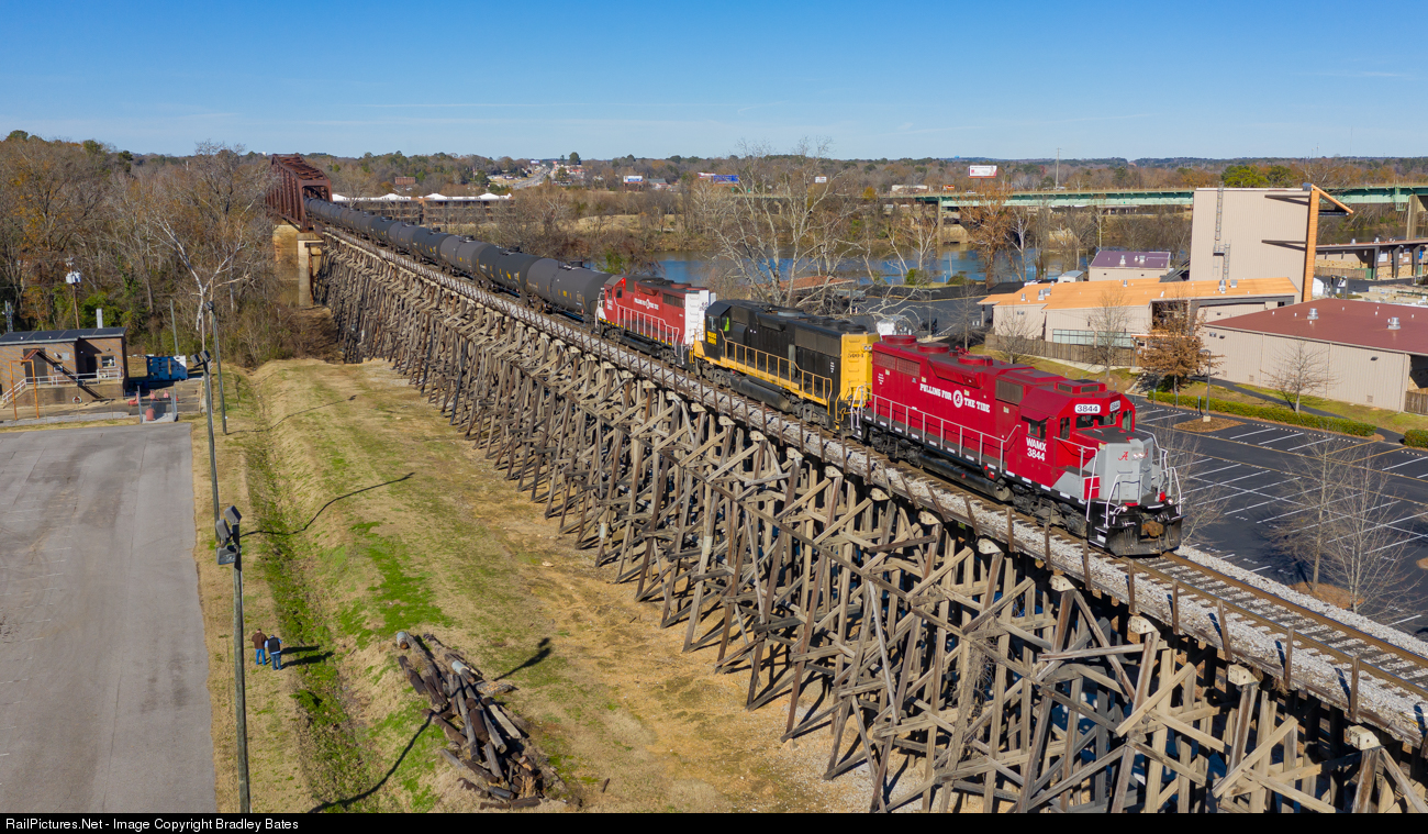 Alabama Southern Yard job 111 has just finished dropping off a cut of cars in Northport and is seen here crossing over the Black Warrior River in Tuscaloosa, AL., on their way back to their yard with WAMX #3844 leading the way. In 2011 Alabama Southern painted two of their GP35's into a special scheme honoring the Alabama Crimson Tide Football team and the University of Alabama, the 3844 has recently been rebuilt and repainted, the other GP35 #3851 (seen 3rd out in the photo) is still wearing the same paint scheme it was put into back in 2011