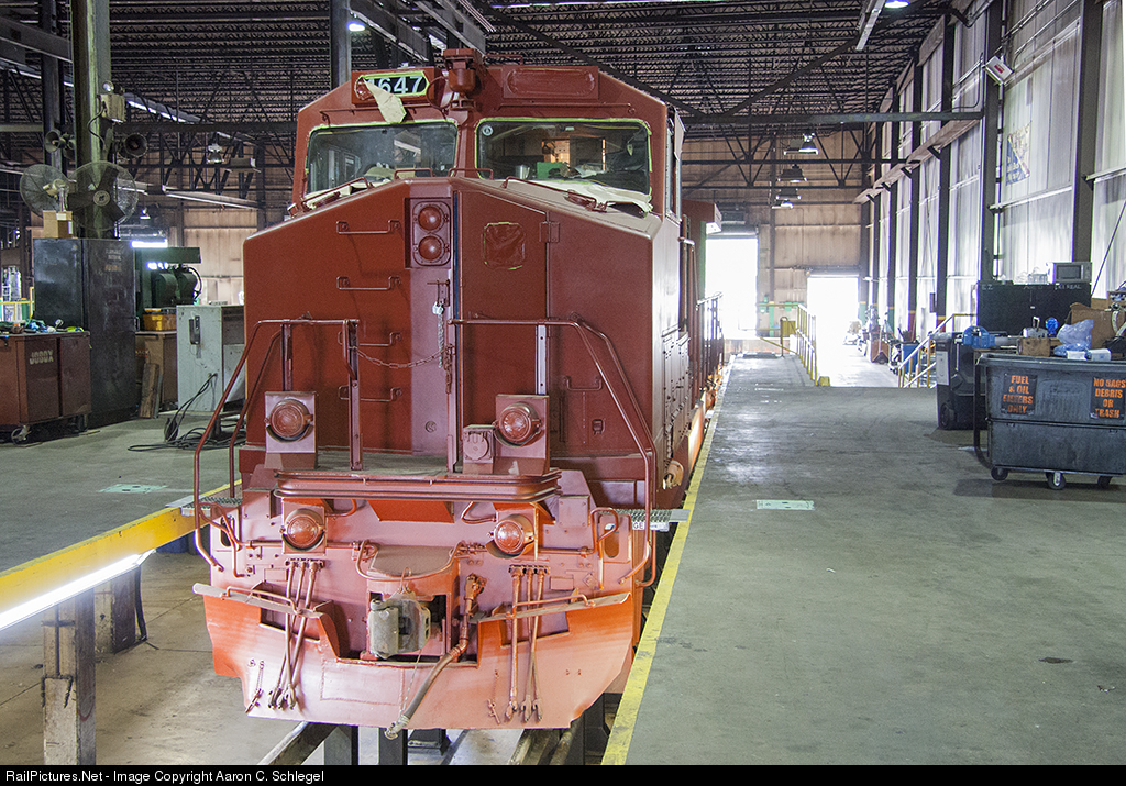 | In the middle of a full makeover, BCOL 4647 undergoes inspection and upgrades while the primer is still curing. This was the transition from the BCOL Blue and white scheme to the CN Black and Red. Other than the BCOL lettering on the cab and the Ditch Light arrangement, she will be indistinguishable from the rest of the CN fleet. |
