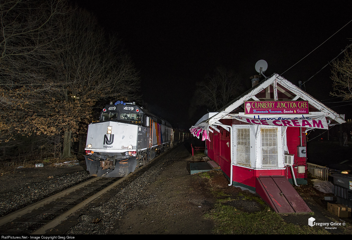 "Ice Cream Box at Cranberry" New Jersey Transit F40PH-2CAT #4119 leads Pascack Valley Line train 1631 past the former Fairmount Avenue Station, now Cranberry Junction Cafe, in Hackensack, New Jersey on a windy Christmas Eve night. Fairmount Avenue Station was built 1870 as part of the extension for the Hackensack and New York Railroad. It was taken over by the Erie Railroad 1890s and New Jersey Transit in 1980. By 1982, the station was closed due to it's close proximity to the more favorable Anderson Street Station. The station house still stands as the Cranberry Junction Cafe.