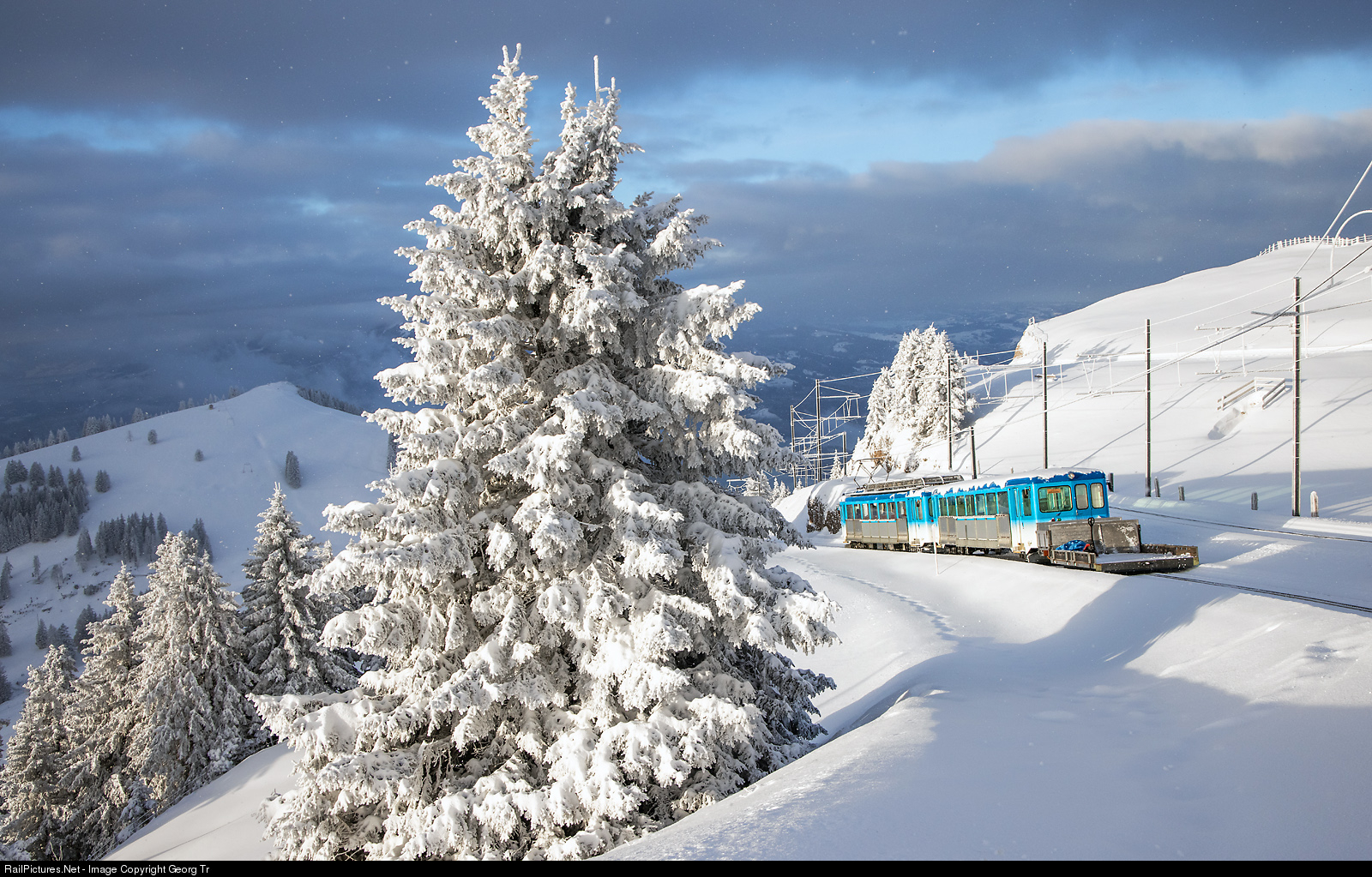 | First down running train of the Rigibahnen from Rigi Kulm down to Arth Goldau, 120, below Rigi Kulm. Cogwheel railcar BDhe 2/4 # 12 (built 1949 by SLM and SAAS), cab car Bt # 22 (built 1958) and a lowfloor freight car. The day before, about 30 centimeter (12 inch) snow fell on the Rigi and the night was rather cold (about -10 Celsius/ 14 F) |
