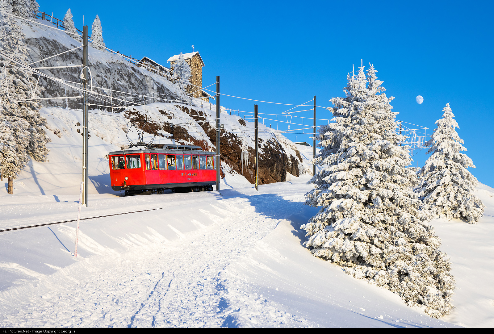 | Cogwheel railcar Bhe 2/4 # 1 of the Rigi Bahnen, built in 1937 by SLM and BBC for the Vitznau-Rigi-Bahn (VRB), running slowly (max 12 km/h) down the mountain below Rigi Kulm, as second train 1146 (reinforcement). |