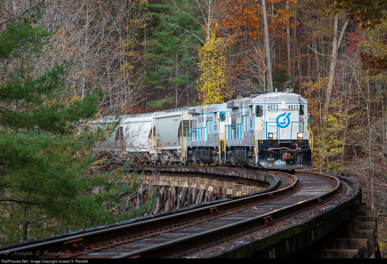 With the last of the fall colors hanging on, Lhoist North America’s two ex-Southern Railway GE B23-7’s lead the Crab Orchard mines road train to the NS interchange in Rockwood over one of the many trestles that can be found on this stretch of the former Tennessee Central mainline. Since the arrival of the 3043, it's been rare for either of the high hoods to appear on the point of the road train, so to have both of them powering the days train is certainly a plus, especially since the 4021 is rarely seen on it dating back to its Franklin days. This would also turn out to be the first day for about a month that these engines would be the road power while the 3138 was getting radiator repairs & the 3043 would serve as the plant switcher.