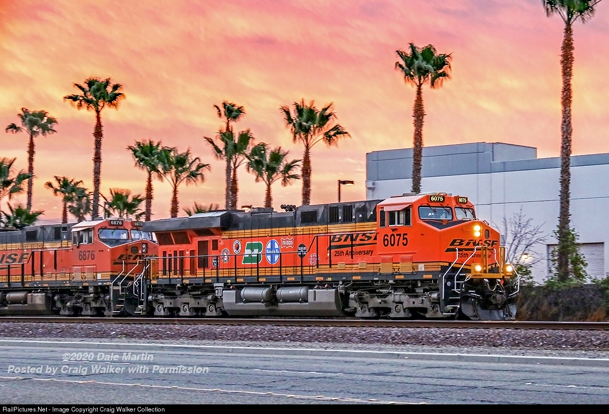 BNSF ES44AC 6075, one of the railway's ten 25th Anniversary engines, leads train Z-NYCLAC through eastern Anaheim, paralleling Orangethorpe Avenue near Kellogg Drive, as the sun rises on December 27, 2020. Dale Martin Photograph, posted here with permission.