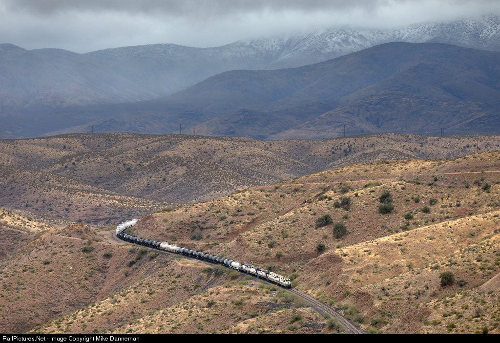 It’s rainy and cold in the high desert of Arizona as the third run of the day of Freeport McMoRan brings 34 cars down the ramp below Corral Road grade crossing between Morenci and Clifton on October 27, 2020. Snow dusts the higher mountain tops as seen in this view from the old abandoned grade of narrow gauge Shannon Arizona Railroad, later upgraded and standard-gauged, and used by Phelps-Dodge as the rail link between Morenci and Clifton until 1965. This grade is now a hiking trail.