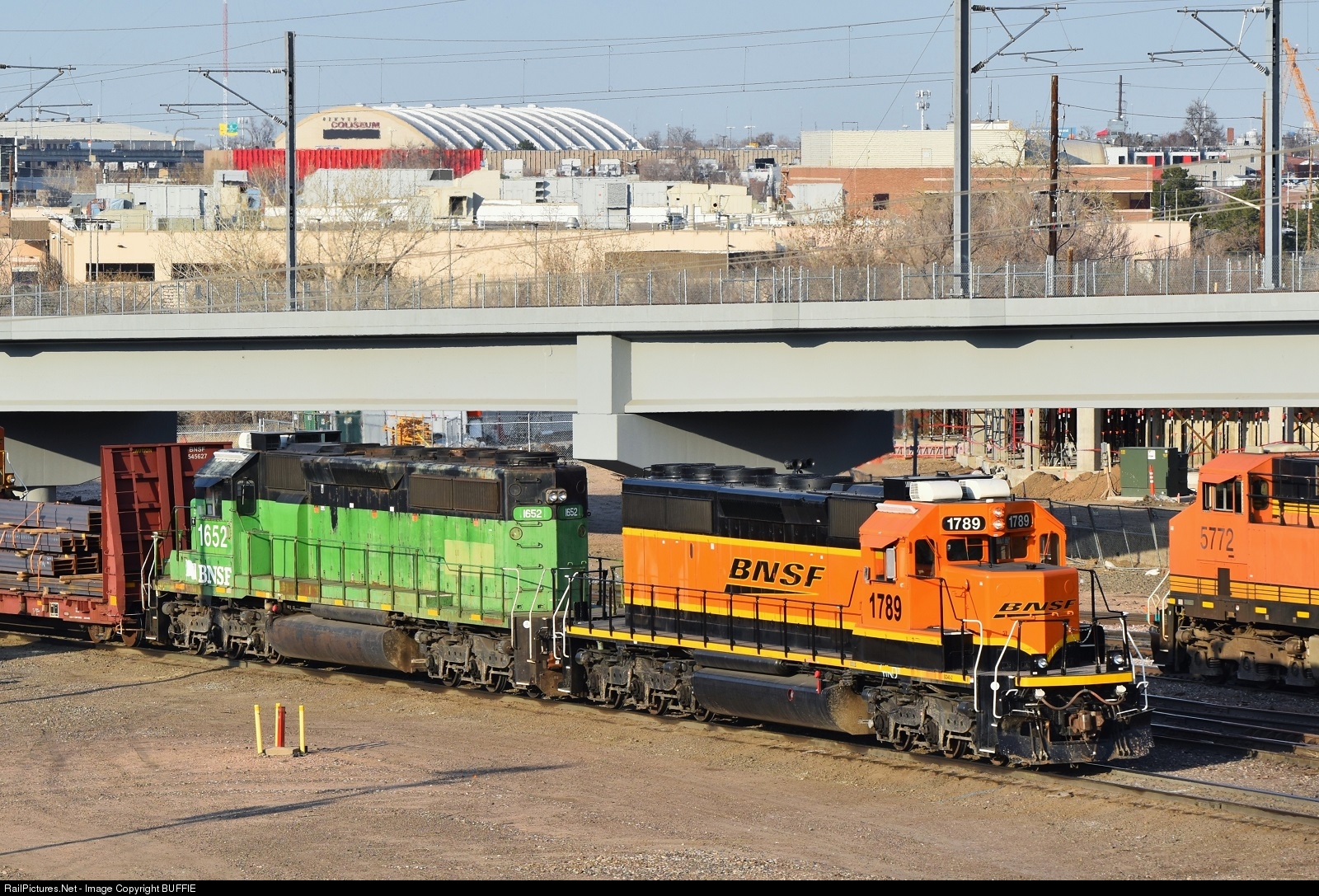 | BNSF 1789 (SD40-2) works the yard with another former Burlington Northern SD40-2. It is not uncommon to find former BN units still in their cascade green paint working the Denver Yard. |