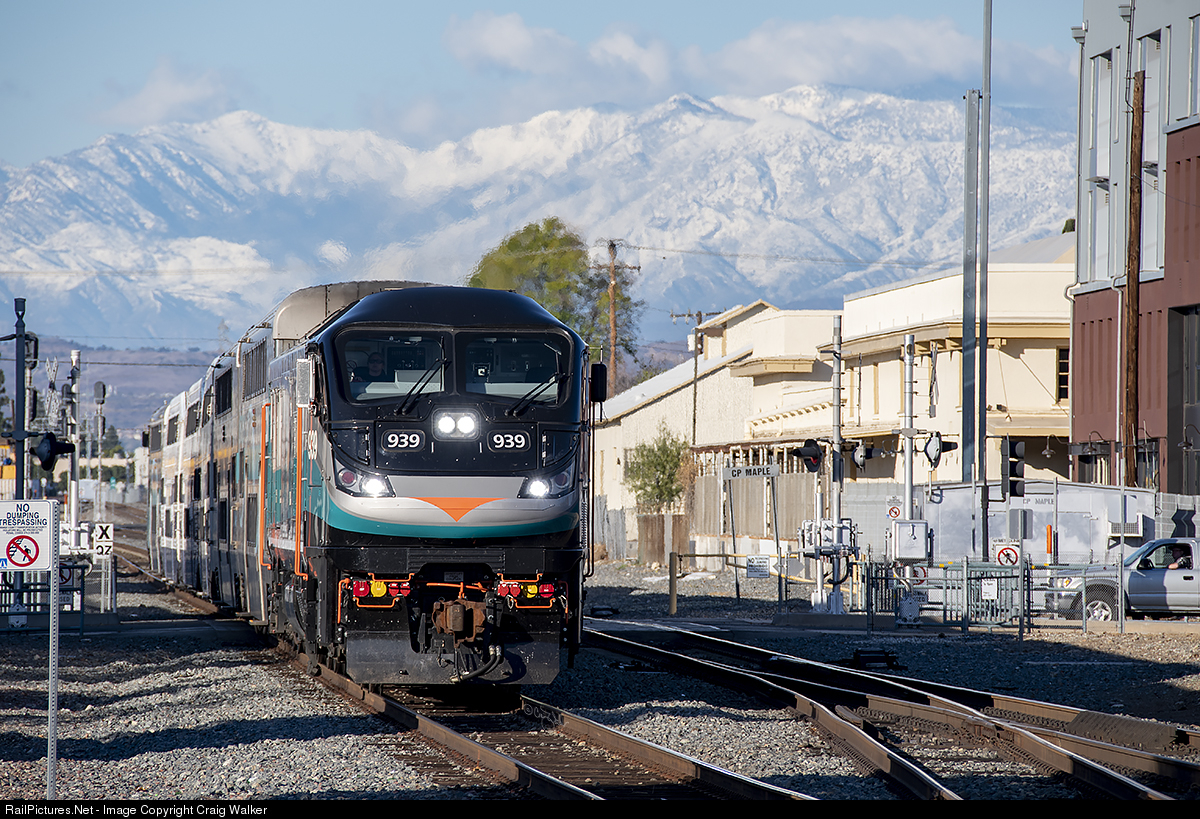 The San Gabriel Mountains have finally gotten their first coating of snow for the season, and the following day Metrolink Orange County Line train 684 passes through Control Point (CP) Maple, and between old citrus packing houses that are now part of the Chapman University campus, just north of the station in the city of Orange. SCAX F125 939, built by EMD in June 2018, is in charge of this train as it heads to Laguna Niguel/Mission Viejo from Los Angeles on a beautiful December afternoon. [Fun fact: There is no mission located in Mission Viejo.] (Orange, California – December 29, 2020)