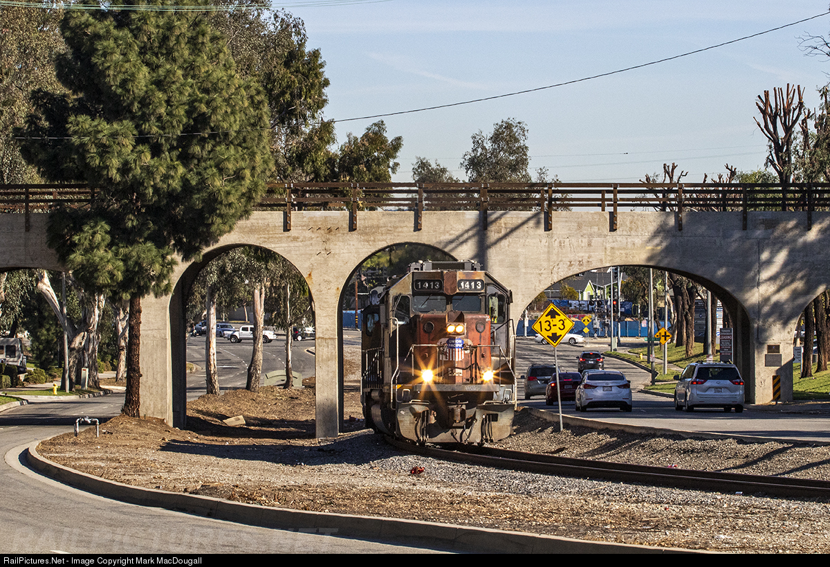 | The Torrance Local passes under the locally-famous PE bridge as they come into their namesake City. Leading the way on today's LOW10 is SP painted 1413 heading light for US Gypsum to pick up a single boxcar. The bridge was once used as part of Pacific Electric's line from San Pedro, and went to steel mill at what is now Honda's US headquarters. Meanwhile the trackage the power is traversing is on what was once PE's line to their main shops in Torrance. |