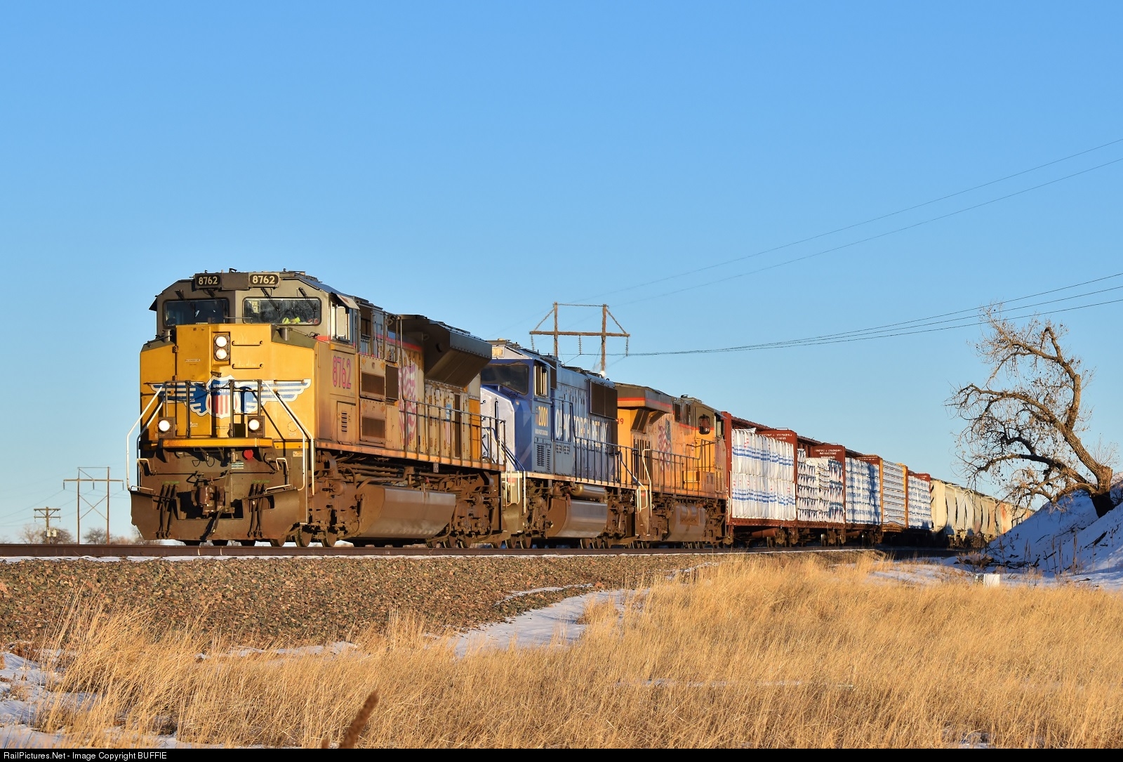 UP 8762 SD70ACe provides some extra muscle to the consist which includes UP 2001 as they run towards Milliken, Colorado on the old Great Western Railway branch.