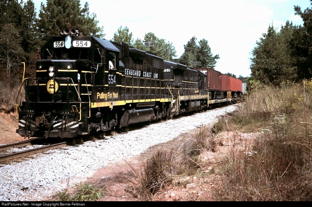 | Seaboard Coast Line GP38-2 #554, on Atlanta & West Point rails, running as A&WP extra SCL 554 west. #554 was built November 1973 and later became Seaboard System/CSX #2554 |