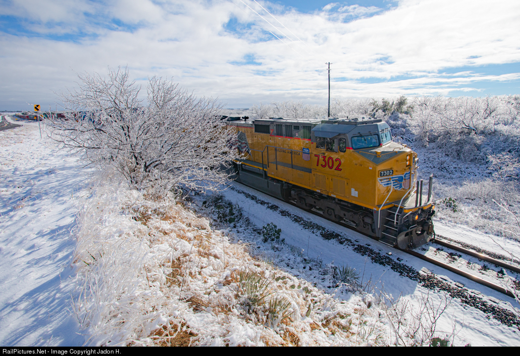| Overnight on New Years Eve west Texas got several inches of snow creating a winter wonderland, with my part of Texas (DFW) just getting rain I decided to spend the day out west shooting what I could on the UP in the unusual (to me) settings. One train was this westbound stack train led by UP 7302. By the time this train got to me the sun had come out and snow was starting to melt at accelerated rates, by sunset everything would look normal once more. The sun didn't help either as i had no way to the sunny side before this guy showed up |