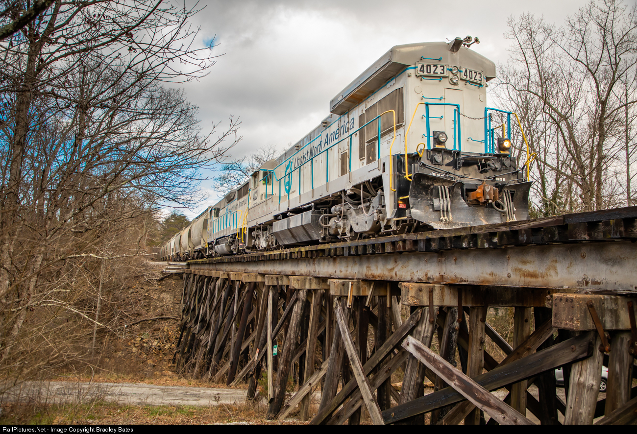 Lhoist North America's road Train from Crab Orchard to Rockwood, TN., passes through Ozone, TN., as they cross over one of several trestles along the former Tennessee Central main on their way back toward Crab Orchard with interchange from Norfolk Southern.