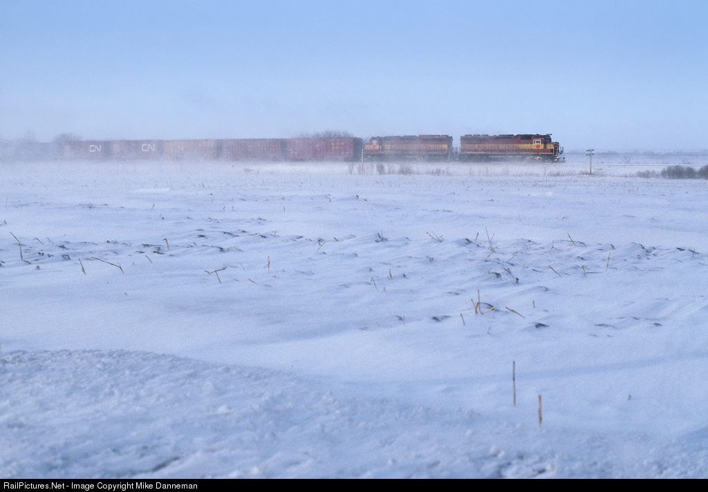 Fond du Lac, Wisconsin, received over two feet of snow over the previous three days before a frigid Arctic high settled in over the region. On January 27, 1996, Wisconsin Central train 43 has just crossed Lost Arrow Road as it descends Byron Hill, south of Fond du Lac, in extremely high winds and well below zero temperatures.