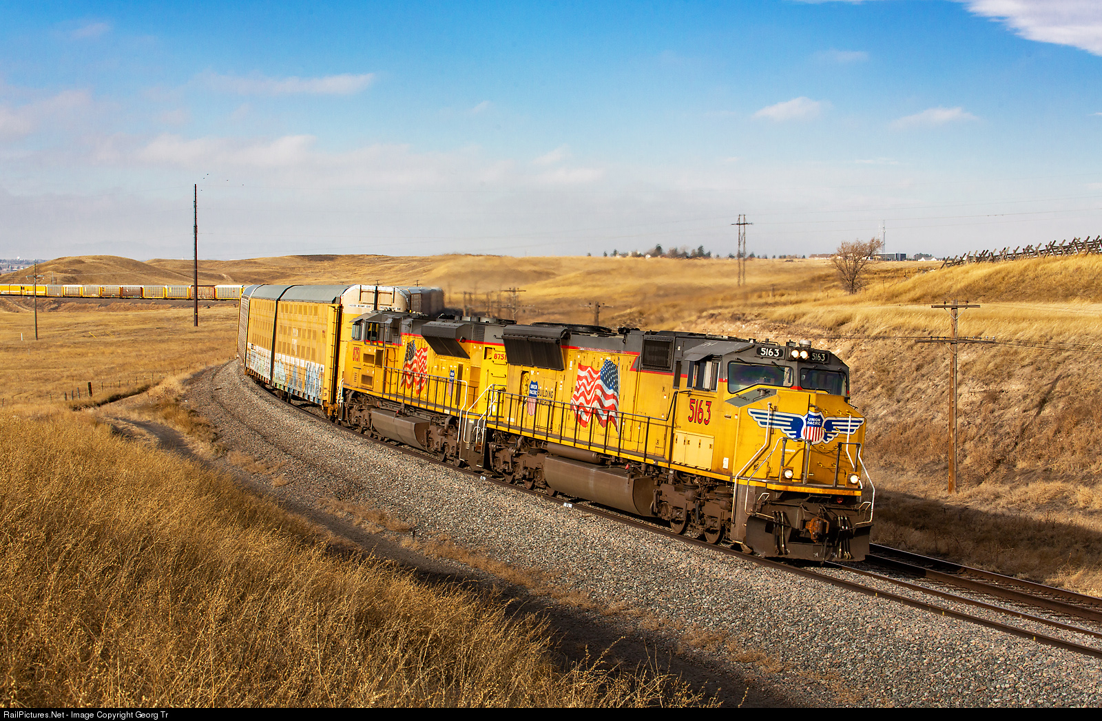 SD70M # 5163 and SD70ACe # 8751 of the Union Pacific with an empty auto rack train on Archer Hill eastbound.
