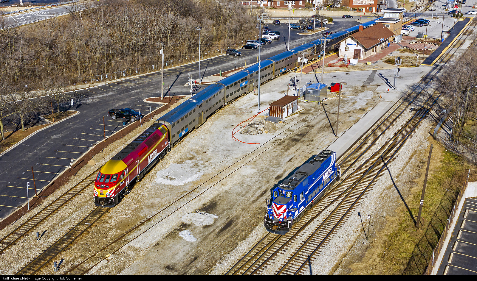 One of Metra's Rock Island District switchers, NIRC 10 (GP23ECO) arrives at Vermont Street while the 425 brings a mid-day outbound train on platform 2.