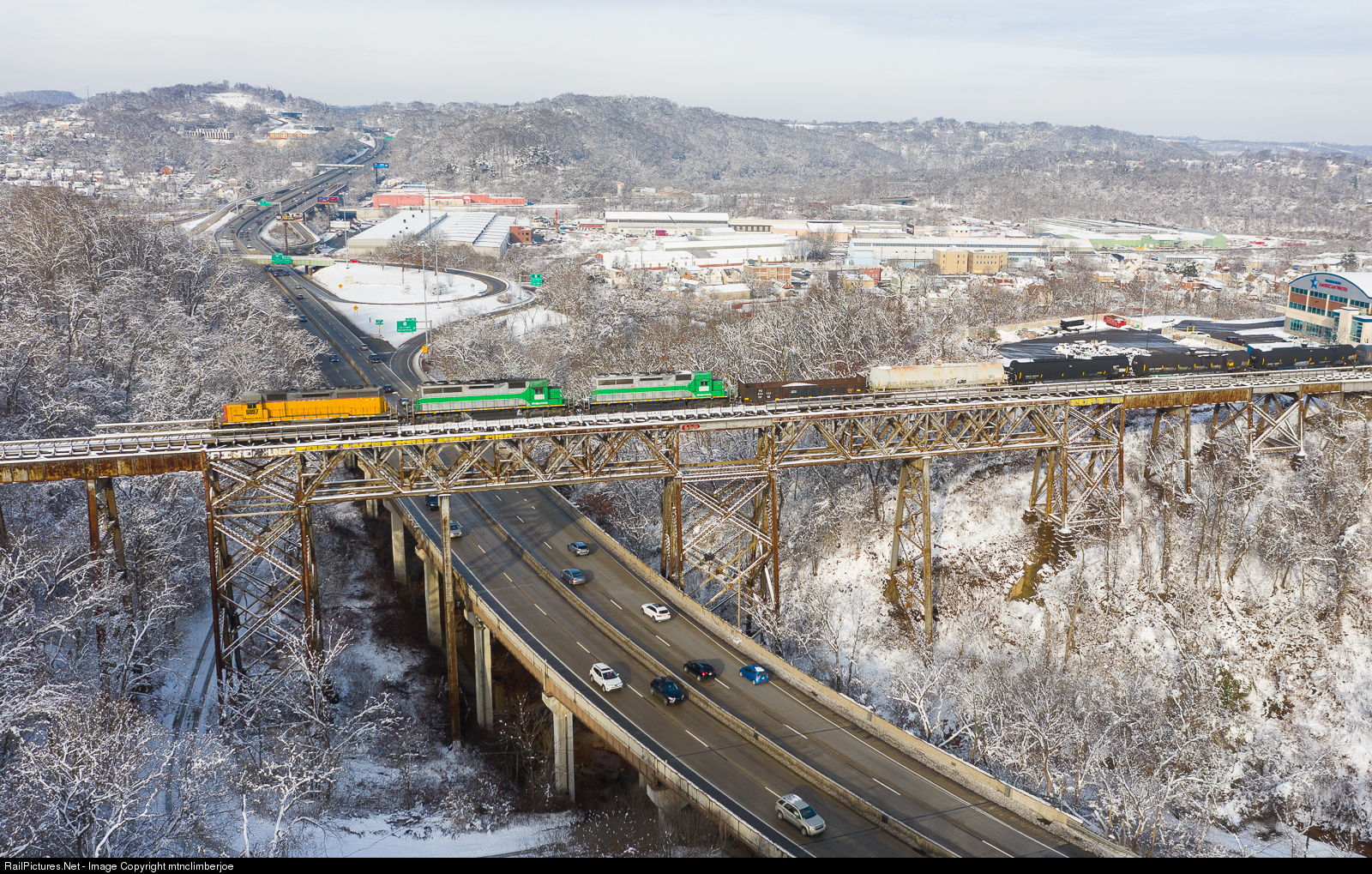 A trio of former lease SD40-2's take headroom on the trestle over I-376 as the Wheeling & Lake Erie 610 yard job puts together cars for the Westland Turn at Rook Yard in Rook, Pennsylvania.