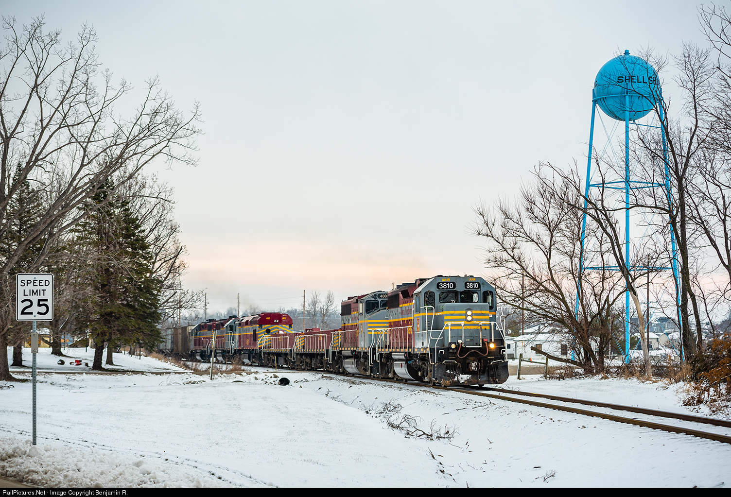 Iowa Northern's "south job" had quite the power lash-up on this snowy December day. Pictured here are IANR 3810 (GP38-2), 4003 (GP40-2LW), 3955 (slug), 3956 (slug), 461 (F40PHR), 3806 (GP38-2), 3811 (GP38-2). Taken from the main Shellsburg grade crossing on the west side of town.