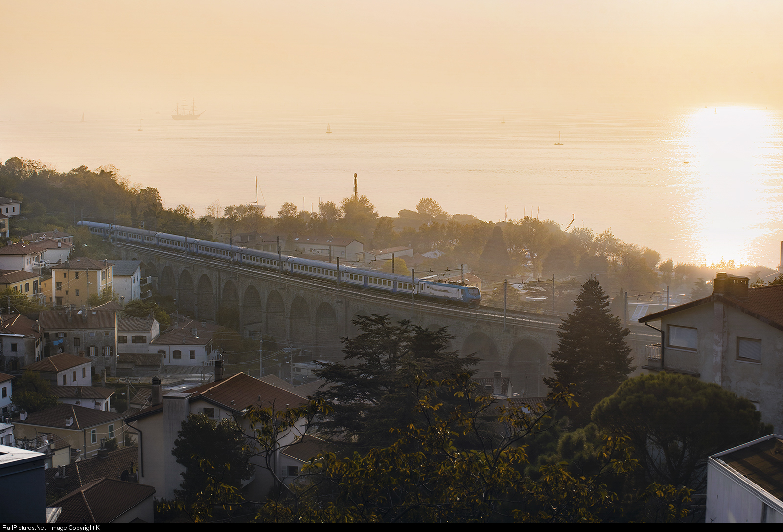 | A lucky shot of an entirely uniform MD-trainset in XMPR livery. It gets ever harder to catch one without any new gray-blue-yellow 'DPR' cars. Shown here is an afternoon Trieste Centrale-Venezia Santa Lucia interregio just leaving behind Barcola as it starts the climb to Monfalcone. If you look carefully you'll spot the departing silhouette of maybe the most beautiful ship of the world: the Amerigo Vespucci. Built in end of the 1920s, it is by origin a training ship in the Italian Navy serving cadets since 1931. Sailing from it's home port of La Spezia it has been around the world, coming to Trieste as a guest for the 51. sailing Regatta Barcolana. |