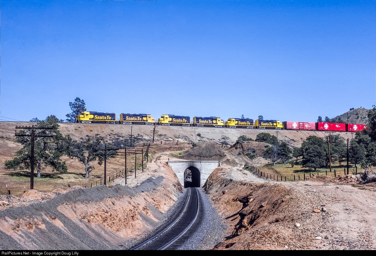 A westbound Santa Fe manifest, powered by a half-dozen GP30’s and GP35’s, passes over the track that it will soon occupy after it navigates the Tehachapi Loop.