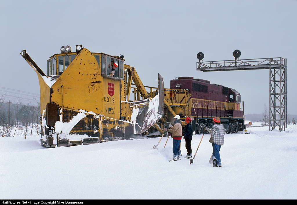 Crews on Wisconsin Central Jordan spreader No. 315 confer before plowing out the railroad’s snow-covered yard at Ishpeming, Michigan, on December 29, 1996. The hydraulic-powered blades that can extend from the sides of the machine are very useful in pushing snow well off the roadbed. Powering the spreader is WC EMD SDL39 No. 585.