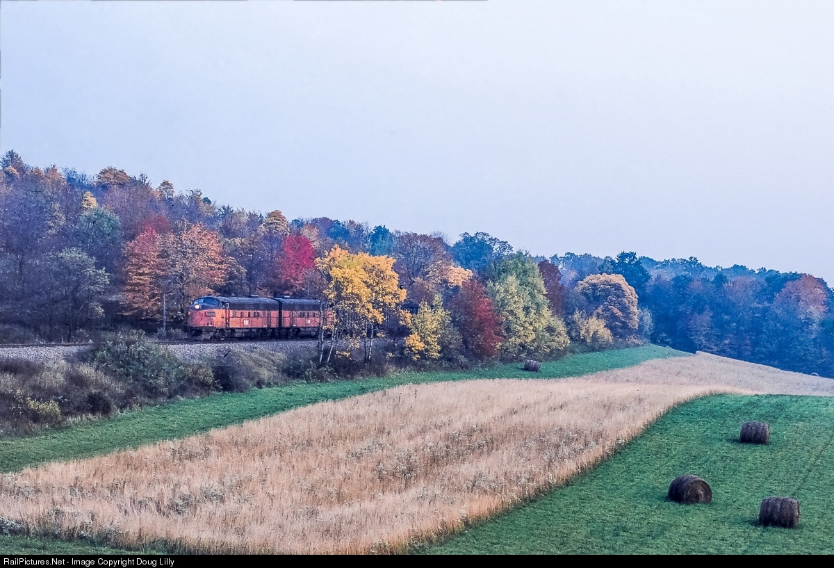 In the last light of an October day, Bessemer & Lake Erie’s Western Allegheny job approaches he small community of Troutman, Pennsylvania. The two F7’s are now on the Reading & Northern roster, awaiting a return to service.