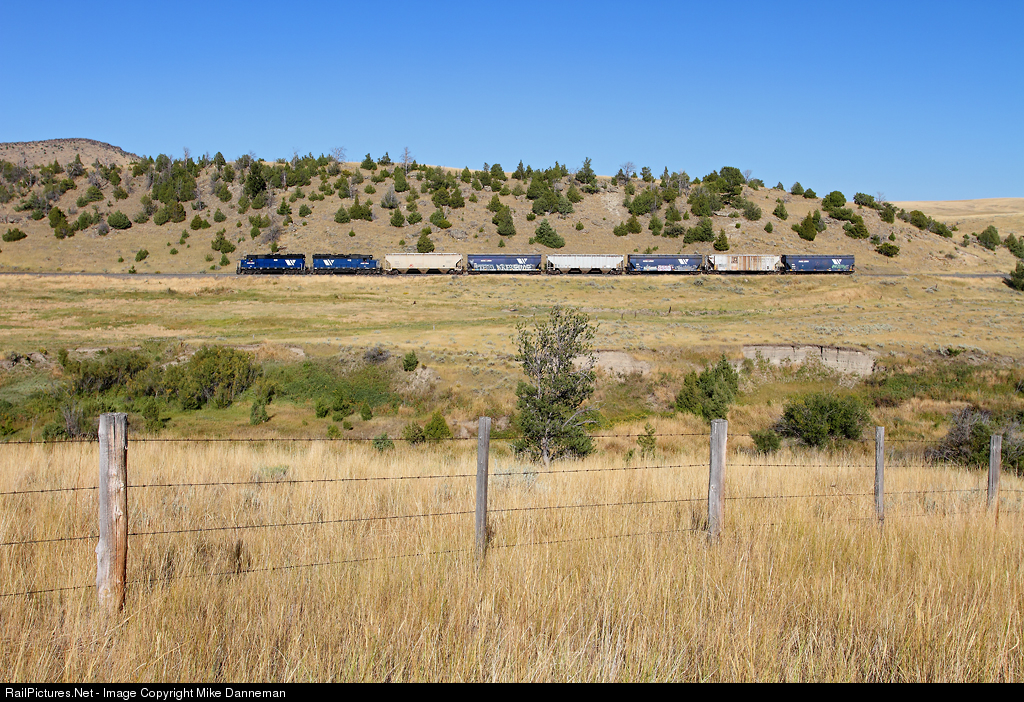 Montana Rail Link’s local to Harrison, Montana, heads down the 2.2% grade of the branch with six cars from the Harrison grain elevator on the afternoon of September 10, 2011. The local works out of Logan and is powered by MRL EMD GP35 Nos. 405 and 406 this particular day.