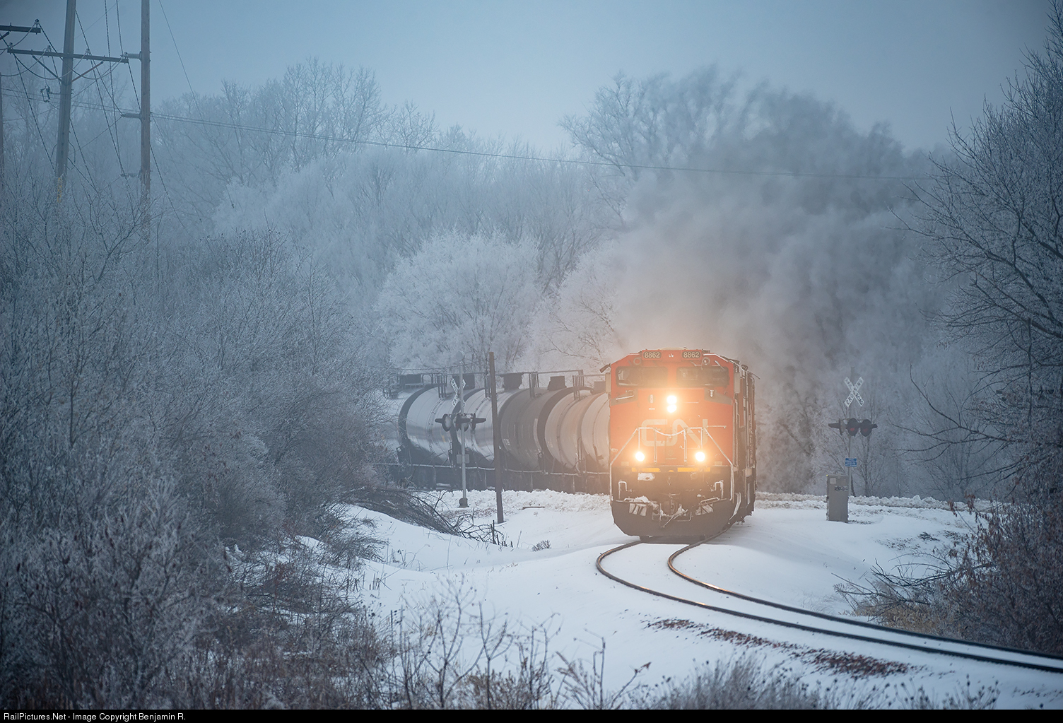CN's M338 on the foggy and frosty morning of Sunday, January 3, 2021. CN 8862 (SD70-2) leads the train, followed by CN 2434 (C40-8M), IC 6200 (repainted SD40-3). The dense (at times) fog made for some beautiful rime ice on the trees at many locations. This location was especially dramatic!