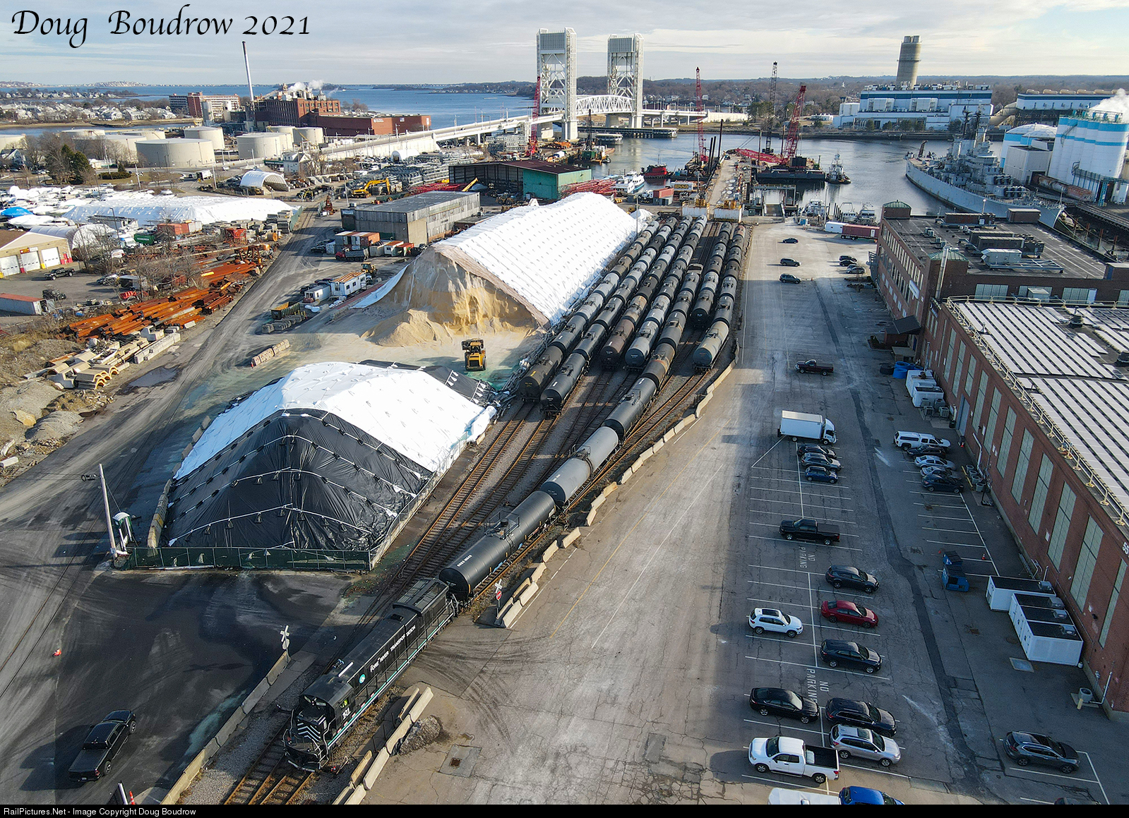 Fore River Transportation is seen pulling a string of empty tanks getting ready to pull them out of the shipyard toward the CSX interchange in Braintree. The Route 3A bridge from Quincy into Weymouth is in the background as well as the USS Salem which was built in these yards during the 1940s. The railroad runs most weekdays and services the Twin River Technologies company. Twin River also owns the railroad. The classic General Electric B23-7 was built as Conrail 1992 in July of 1979.